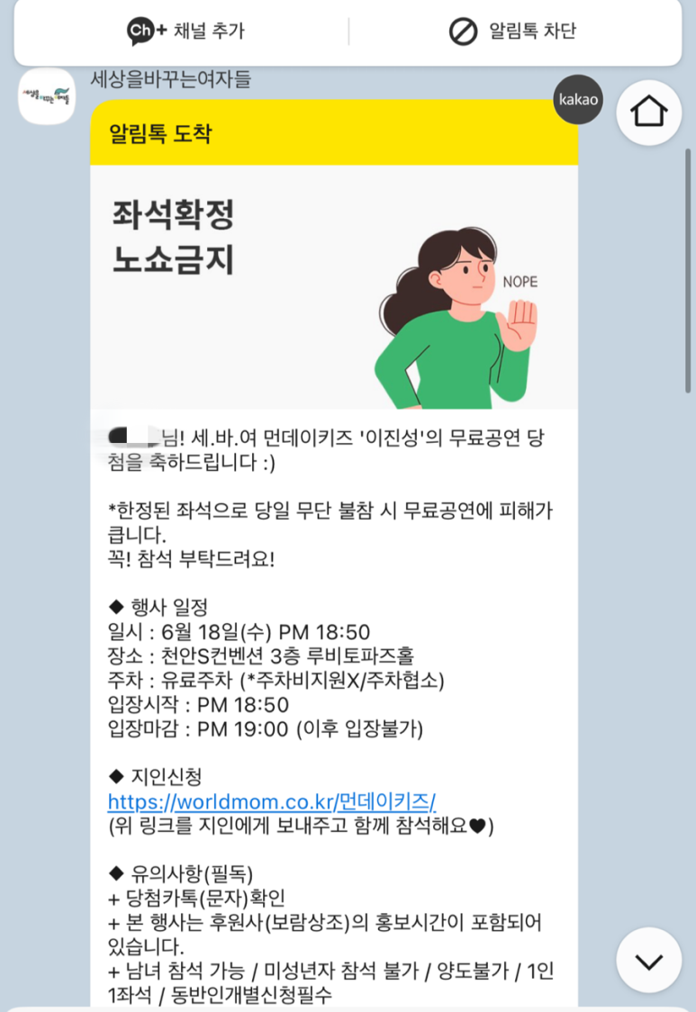 바로 세상을 바꾸는 여자들에서 신청하고 당첨후 진행되는 공연이예요!! 마침 천안S컨벤션에서 진행해서 다녀왔어요.